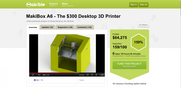 MakiBox is a riff on the open source RepRap 3D printer that fits a print head and motor inside a box about the length and width (but not the thickness, silly) of a sheet of paper. The MakiBox kit will start at $350 while an assembled kit will cost $550.
