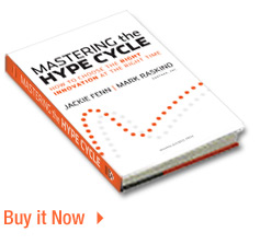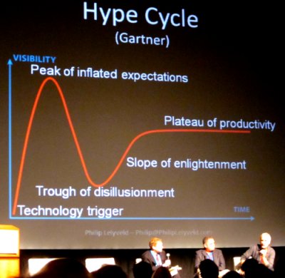 This week, in a keynote interview at a summit organised by the Hollywood magazine Variety, movie director James Cameron discussed the Gartner Hype Cycle. Below is a photo, kindly shared with us by Philip Leylveld, who created some of the slides used in the stage debate about 3D technology in the movies.