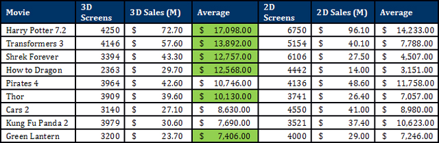 A fairer snapshot is this one below, which shows the relative performance of different 3D movies over the summer. The green boxes highlight 3D outperforming 2D on a per-screen basis.