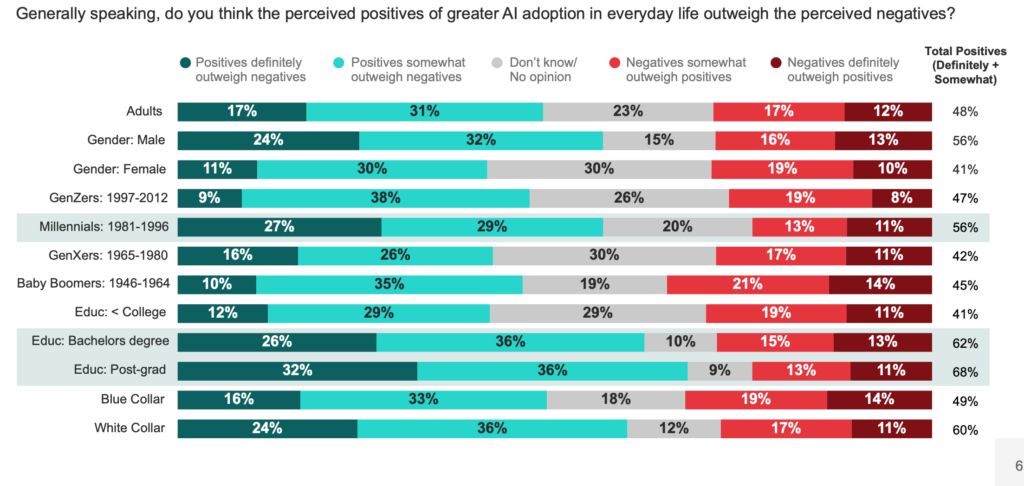 - Although adults have concerns about the potential negative consequences of greater AI adoption, nearly half (48%) believe the perceived positives of greater AI adoption in everyday life outweigh the perceived negatives.