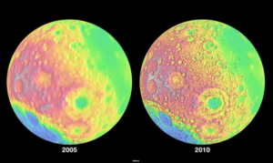 Here, the most recent LOLA digital elevation map, which was compiled in late 2009 (right) is compared to the previous moon mapping achieved by the Unified Lunar Control Network in 2005. Notice the vastly improved detail of the moon measurements.